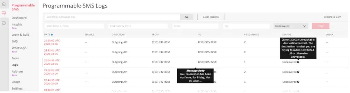 Click Logs then set your timeframe and filter by Status = Failed or Status = Undelivered